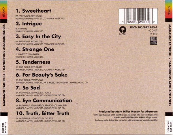 Re-issue. Blue box ISLAND MASTERS printed on CD. Packaging incorrectly lists duration of 3:16 for track 7. On back cover of this edition "Truth, Bitter Truth" appears as track 10 instead of 9. "For Beautie's Sake" also appears mistakenly as 'For Beauty's Sake" and one of its publisher appears twice. ℗ 1981 Island Records Ltd. © 1981 Island Records Ltd.