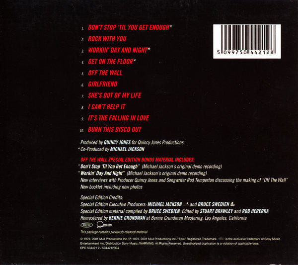 With slipcase. Also released without slipcase. Special Edition Bonus Material: "Don't Stop 'Til You Get Enough" (Original Demo From 1978). "Workin' Day And Night" Original Demo From 1978). Also contains new interviews with Producer Quincy Jones and Songwriter Rod Temperton discussing the making of "Off The Wall," and new booklet including new photos. Re-issue of 1979 release. Remastered at Bernie Grundman Mastering, Los Angeles, California. Made in Austria