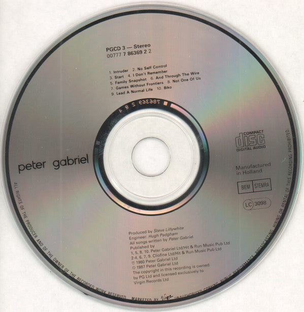 Comes in a standard jewel case with 8-paged booklet. [Backsleeve (P)1980 Charisma Records Ltd (C)1980 Charisma Records Ltd [CD Published By 1, 5, 8, 10. Peter Gabriel Ltd/Hit & Run Music Pub Ltd 2-4, 6, 7, 9. Cliofine Ltd/Hit & Run Music Pub Ltd (P)1980 Peter Gabriel Ltd (C)1987 Peter Gabriel Ltd The copyright in this recording is owned by PG Ltd and licensed exclusively to Virgin Records Ltd. Manufactured in Holland.