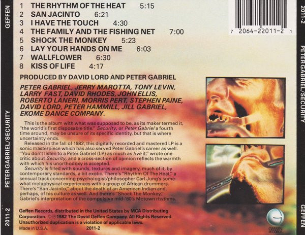 Similar to [r=549713 but with slight differences to the CD disc face:- DIDX 001012, reduced publishing and distribution statement. Tony Levin appears courtesy of EG Records Ltd. Larry Fast appears courtesy of Passport Records Inc. David Rhodes appears courtesy of Self Control. Recorded: at home (the first two weeks with Mobile One) and mixed down the road at Crescent Studios, Bath Remix: Shock The Monkey , Sarm Studios, engineer Julian Mendelsohn with the help of Danny Heaps Digital editing: Advision Studios with thanks to Mike King Digital Mixing facilities: (Sony PCM 1610 system) supplied by Digital Audio Systems Fairlight CMI recording, programming and development: Stephen Paine of Syco Systems, Gabriel, Lord and Fast Digital Delays and reverberation: AMS with thanks to Stuart Nevison and Mark Crabtree Management: Gailforce with special thanks to Gail Colson and Norma Bishop Thanks to: Jill, Stephanie, Tattie, Eda, Glenn and Gaynor "The Rhythm Of The Heat", "San Jacinto", "The Family And The Fishing Net" and "Lay Your Hands On Me", © Peter Gabriel Ltd. BMI "I Have The Touch", "Shock The Monkey", "Wallflower", and "Kiss Of Life", © Cliofine Ltd. BMI MADE IN U.S.A. Printed in U.S.A. Album originally released in 1982.