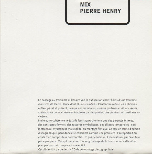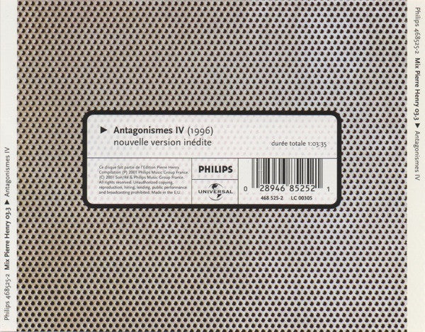 Nouvelle version inédite [New unreleased version Durée totale [Total duration 1:03:35 Composed in 1996. On tray card: Compilation (P) 2001 Philips Music Group France. (C) 2001 Son/Ré & Philips Music Group France. Made in the E.U. On CD: Compilation (P) 2001 Philips Music Group France. Inside booklet: Commande de la WDR de Cologne. Studio Akustische Kunst / Klaus Schöning. Réalisation Son/Ré. (P) 1996 Pierre Henry. The catalog number is printed as '468 525-2' on the back cover. The catalog number is printed as '468525-2' on the spine, back of booklet, and disc. Packaged in a jewel case with clear tray and 12-page booklet. This CD belongs to a collection of 17 CDs that were released in 1999-2001 as a retrospective of the electronic music pioneer.